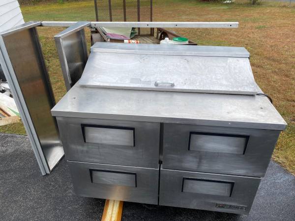 TRUE brand refrigerated sandwich table with drawers. Unit has new compressor unit(pictured) Has locking wheels and stainless shelves that bolt to the back of the unit for storage above. I think it will require a refrigeration recharge as it runs but not holding temperature currently. Will need cleaning and testing. Has been in storage for about 18 months. Please email me with any questions. Thanks for looking