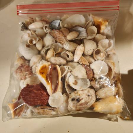 Sea shell assortment 4 lbs. A decorativ assortment, snail conch, starfishe s filled a clear glass lamp M Queensbury