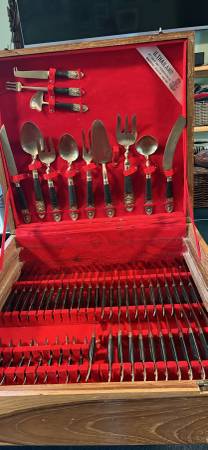 This boxed set has service for 12. It is bronze or brass with wood handles and many serving utensils. It is used in good condition. Purchased in Bangkok by a former Air Force pilot in the 1960’s or...