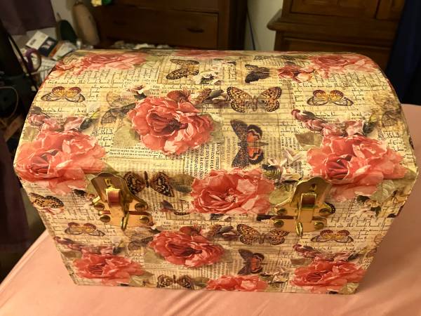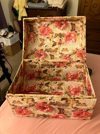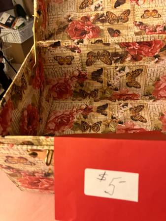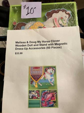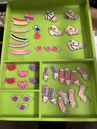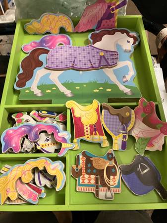 Three activity learning Melissa and Doug wooden toys; magnetic horse to decorate with six different dress up tails, mane, legs etc. $10, five scene pictures to create with a 100 appropriate pieces $10, and a large puzzle, $4. Also lovely small dome trunk.12” x 8” x 9” with latches and handles, no key lock, $5. Paw Patrol wall figures, $4. Or $30 for all. Pickup in Ballston Spa.k