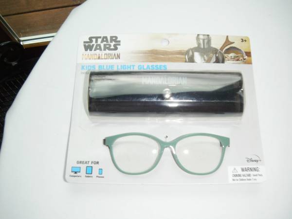 These are a new pair of Star Wars Mandalorian blue light glasses with protective storage case that is easy to store in a backpack. The glasses protect eyes from the harmful effects of blue light from electronic devices such as computers, tablets and cell phones. Frame colors are either grey or light green; ages 3+. One pair of glasses is $5 or $9 for both.