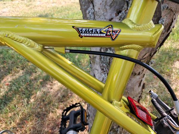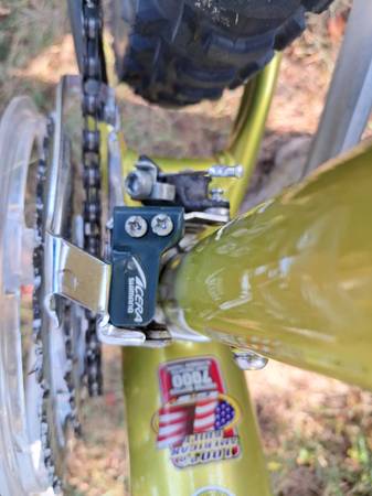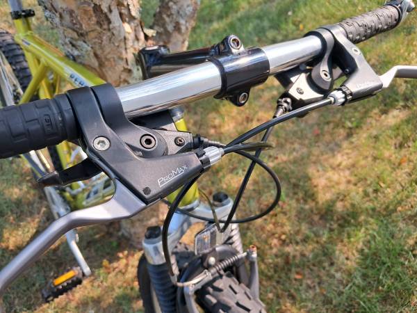 Color is Solar Citrus Mint. Aluminum triple triangle frame that’s made in the USA! 18” frame, but it's not tiny. I’d say good for anyone who is 5’10” or less. Rock Shox forks. Some components are Shimano or Promax. 24 gears. Lots of thread on tires. Manuals included.