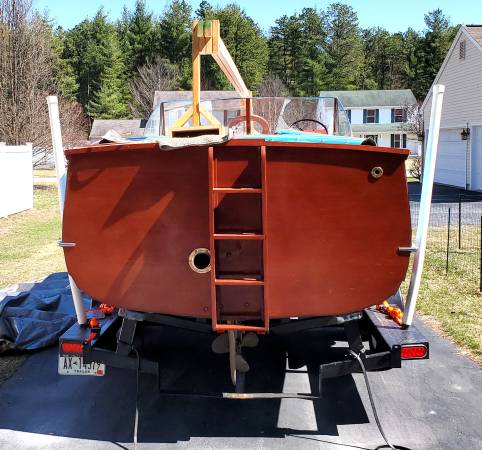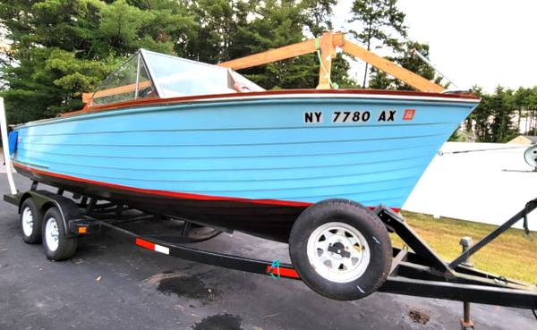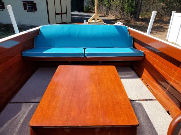 Meticulously refurbished Class Chris Craft 22-foot 1958 Sea Skiff Ranger. New deck flooring, re-upholstered seat cushions, new 130 cu. in M Hercules engine, new paint and varnish inside and outside, and more. Deck has plenty of room for walking around; seats offer lots of places for family and friends to relax. You can even nap in the cuddy! Also included is the cushion for the engine cover (see photo) as well as enough fabric for making cushions for the cuddy (fabric roll - 58 " wide by ?? many yards - see photos), as well as a navigation light (see photo).