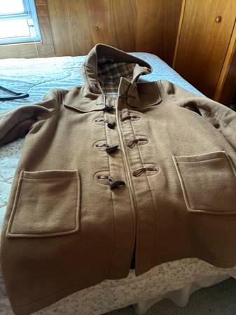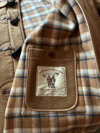Men's wool camel colored 3/4 length stadium coat with hood made by Original Montgomery. Tag says size 50. Made in England. 58" circumference (chest) under armpits. Price for new @ $200. Perfect for...