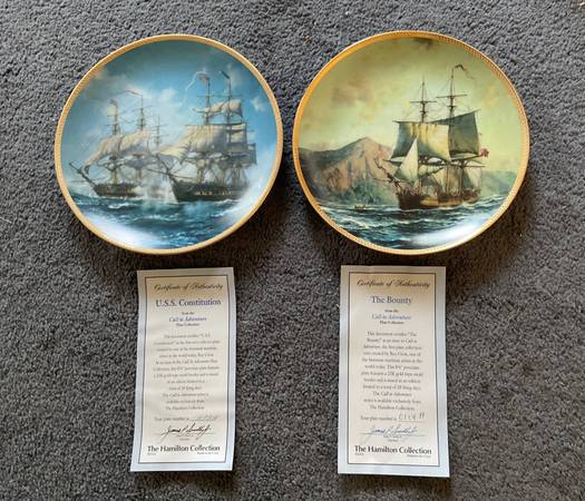 The Hamilton Collection Call to Adventure 8” Collectible Plates, (1)The Bounty and (2) USS Constitution. Includes Certificates of Authenticity. In original styrofoam.