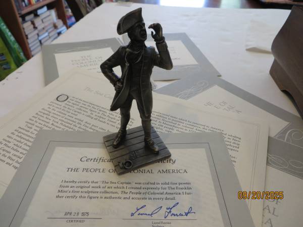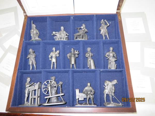 The product is a set of 13 fine pewter figurines depicting people of Colonial America, part of the Classic Collection by Franklin Mint. These figurines, created by artist Lionel Forrest, are signed by the artist and made of silver-colored pewter. Each figurine is approximately 7 inches tall and comes with paperwork. This limited edition collection was manufactured in the United States during the late 20th century, specifically between 1974-1976, making it a valuable and original decorative collectible for those interested in Colonial American history and artwork. Gorgeous figurines and makes an excellent unique gift for those hard to buy for history buffs. Comes with Display Case and collection paperwork as well as individual paperwork and date forged. Beautiful Pieces!!