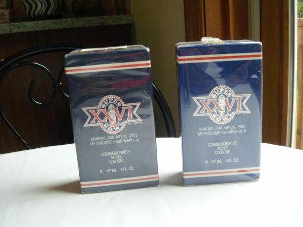 Here's your chance to own a piece of sporting history! This item is an unopened vintage bottle of cologne from the Superbowl game between the Washington Redskins and the Buffalo Bills held on January 26, 1992 in the Metrodome in Minneapolis. The box is in excellent condition with the wrapper intact and security tag attached. Price is for 1 bottle or both for $50.