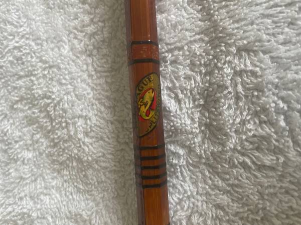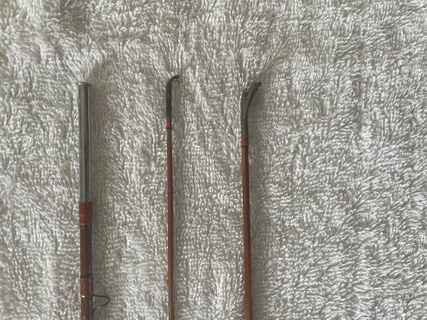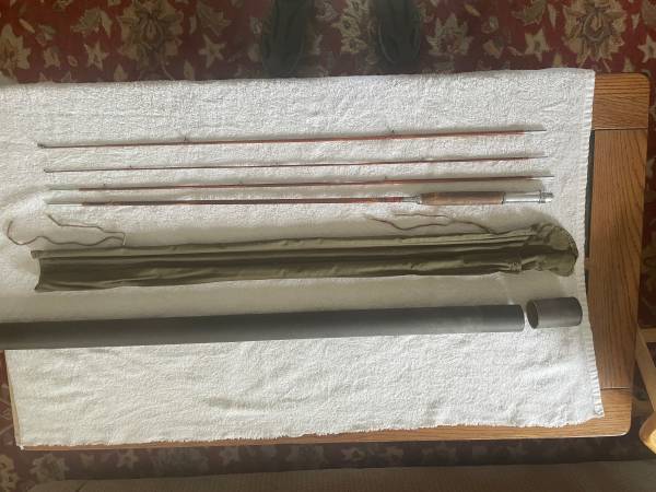 Bamboo 9’ fly rod, 3 piece with extra spinning, with A.F. Meisselbach Featherlight No. 260 Fly Reel. Split switch rod handle spins around for spinning rod section. Makes 6’ split bamboo rod for spinning fishing. Cloth case and tubs, rod, guides, handle, all in excellent condition. Varnish on rod is excellent. 2 rods in one