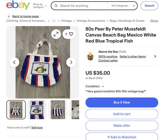 NEW, Never used, 80s Peer By Peter Mussfeldt Canvas Beach Bag. White, Yellow, Blue w/Tropical Fish. See attached photo for similar on sale at eBay. Same style, different color scheme.