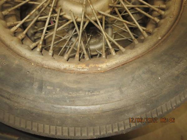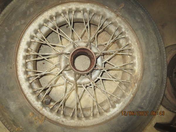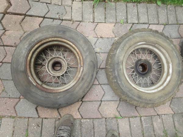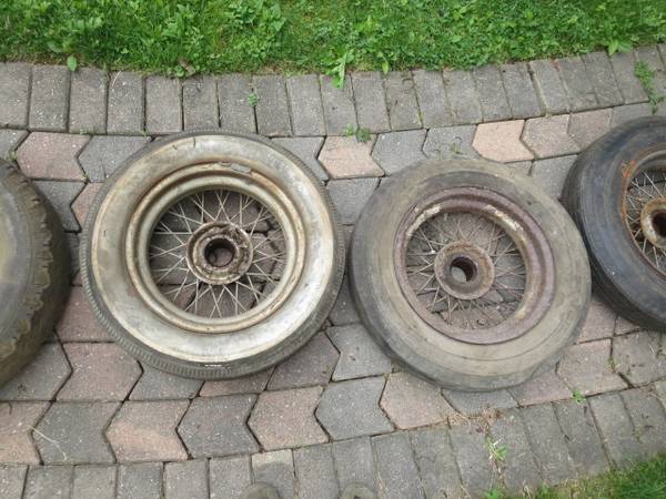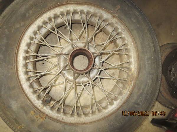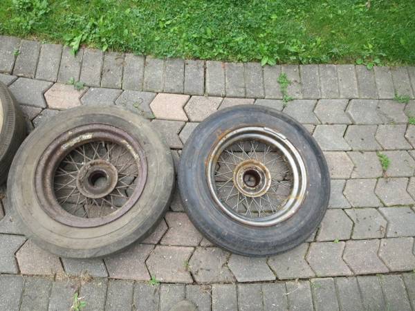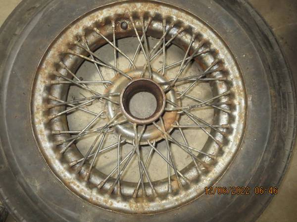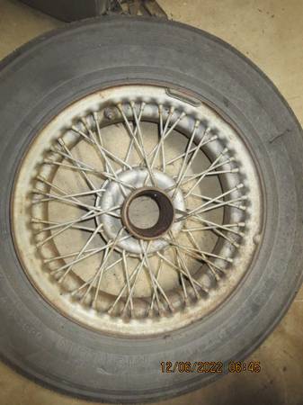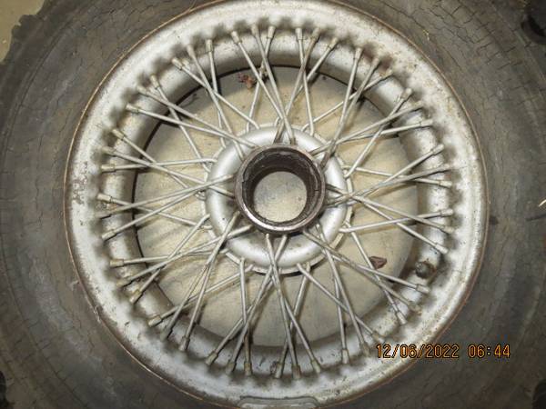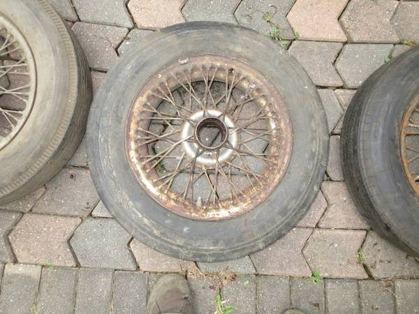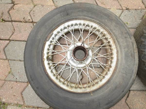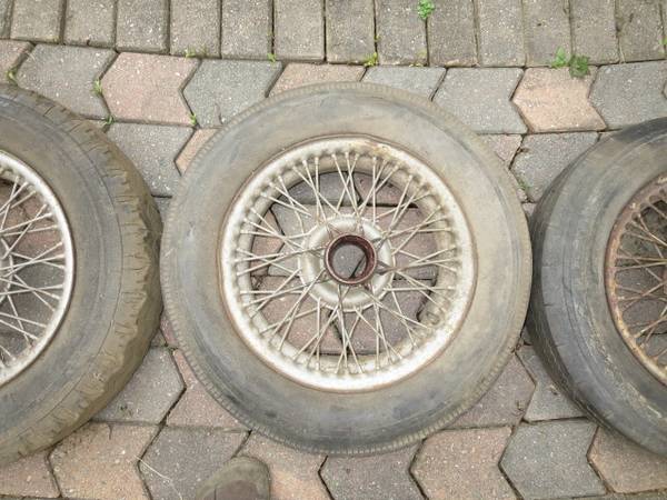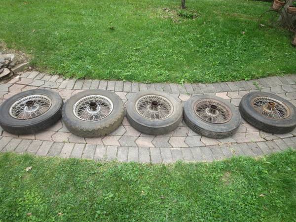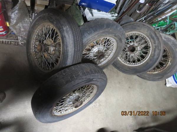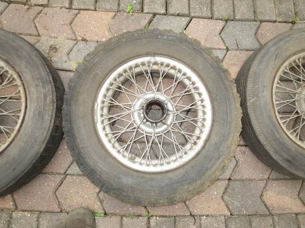 5 Wire Rims with tires. Most of the tires hold air but they are all old. The 5 Rims are in great shape they have 48 spokes. These cam off an Austin Healey 100- 4 but will fit several Brittish...