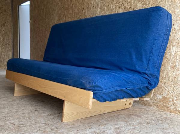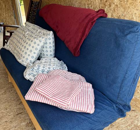 LL Bean all wood (ash) futon frame (made in Maine) with 8” mattress, mattress protective cover, and washable classic denim cottage futon slipcover. Please see all mattress dimensions in photos. Used infrequently, like new. Comes with full set of LL Bean flannel striped sheets in rustic red and 100% cotton sheet set in a neutral and blue print, 2 pillows with protectors and matching pillow cases, and burgundy fleece blanket. All purchased new for $1,000. Will sell everything for $250. Price is fair and firm. Please respond to ad with name, email and/or cell phone. Will answer serious inquiries only. Thanks very much.
