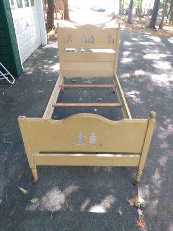 Antique single or cot size 36 X 74. Very well made piece. Rolls beautifully on 4 wooden casters. Missing one spindle on footboard. Yours at $25. Thanks for looking.