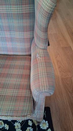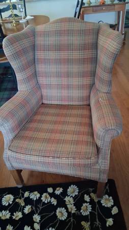Pair of well-made wing chairs. Dual fabric: plaid front with solid sides and back. Good condition. One cushion and arm show wear (see pictures)