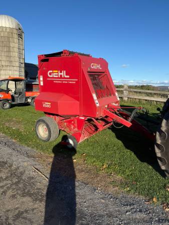 Nice older Gehl 2580 twine-wrap round baler. Makes tight 5x6 bales, solid belts, will need pickup teeth before next season, new hydraulic lines this year, and clean chambers. Used for dry hay and stored inside when not in use.