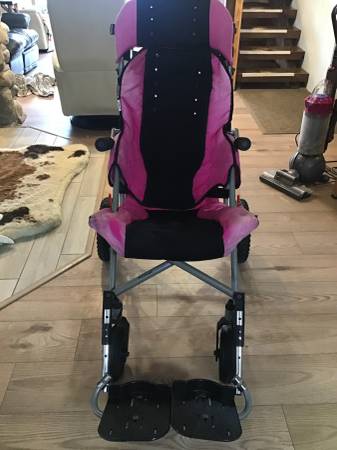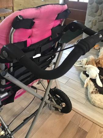 Used but in GREAT condition. Seat cover is faded but otherwise the stroller is very sturdy and in excellent working condition. This is for a large child or small adult up to 170 lbs. Folds for travel.