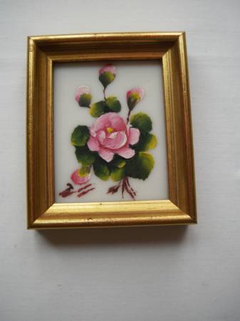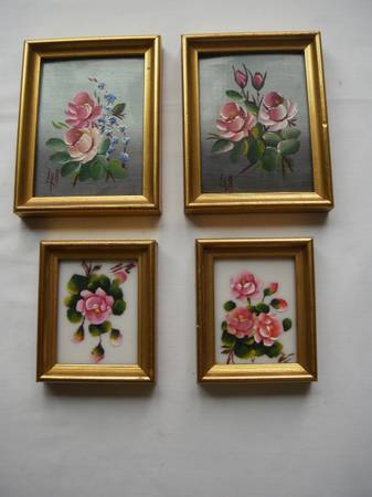 This is a group of four distinct hand painted flower scenes in beautiful gold tone frames. The pictures measure as follows: --Two 4-1/2" x 3-1/2" --Two 3-1/4" x 2-3/4" All items made in Spain;...