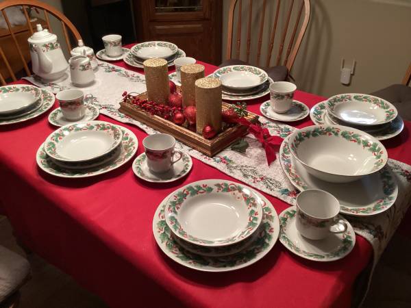 1990 Sango Noel Vintage Christmas China. Serving for 8. Like new….no chips. Set includes: 8 plates, 8 dessert plates, 8 soup or Sal ad bowls, 8 cups with 8 saucers, tea pot, sugar and creamer set, serving bowl and platter. 45 pieces in excellent condition. China is packed and ready to be picked up. Please respond to this listing if interested. Must pick up in Queensbury, NY. Cash only. Thank you!