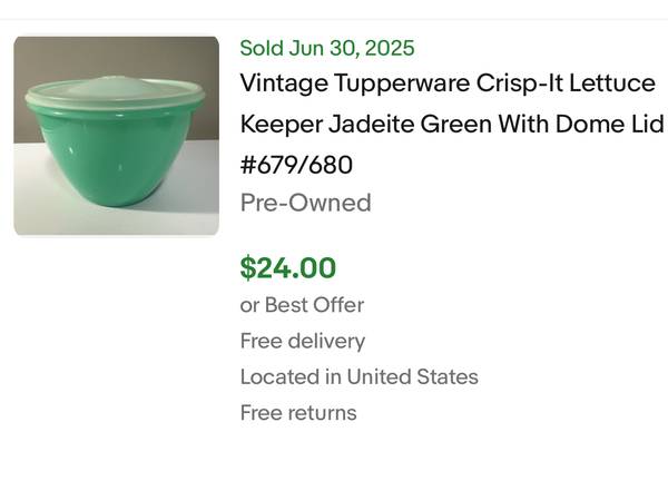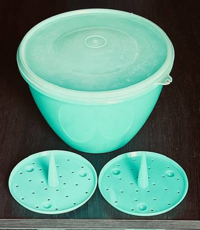 Designed to keep heads of lettuce, cabbage or cauliflower fresh and crisp by allowing air circulation and drainage of excess moisture - works great. Includes round container, 2 course spikes to hold produce away from extra moisture that collects in the bowl bottom, domed lid for extra space, and an airtight cover with patented sealing lid. Approximately 5-1/2" tall, 7-1/4" top diameter. Excellent used condition. Minor surface scratches. Smells fine. Price reduced 33% to $8 including extra spike. (eBay SOLD two: one for $24 and one for $17 plus sales tax. See last 2 photos.) No pets or smoking in home. Free pickup in Saratoga Springs, NY. If out of area: invoice, payment and shipping of orders, totaling at least $20, through PayPal. Check out my other items; will ship together to save on postage. No holds. First come, first served. Cross posted. No pets or smoking in home. Free pickup in Saratoga Springs, NY. If out of area: invoice, payment and shipping through PayPal. Check out my other items; will ship together to save on postage. No holds. First come, first served. Cross posted.