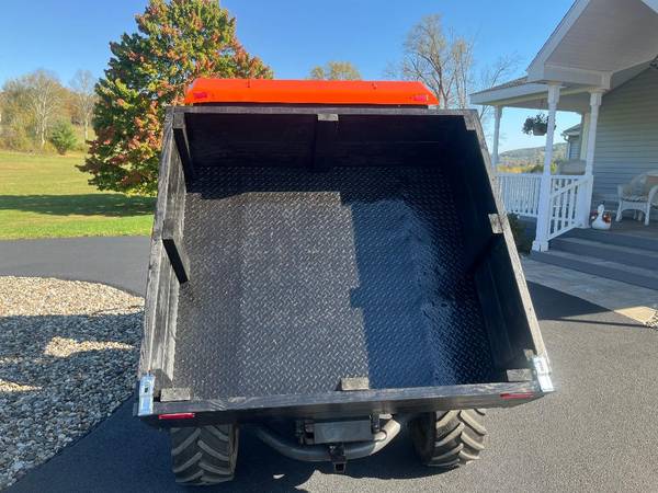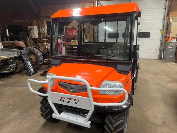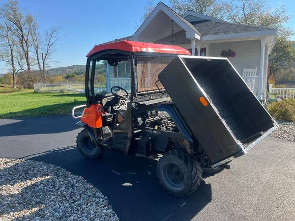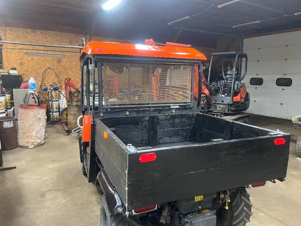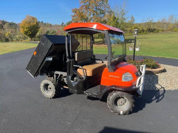 Kubota RTV900Worksite rough terrain vehicle. Kubota diesel 4wd, hydrostatic with 3 ranges plus reverse, power steering, cab enclosure with steel roof and front wind shield no doors. New rear hydraulic dump box with tail gate. Head lights and tail lights. Traction tires. New steel floor with floor mat. Starts and runs well. Guessing appx 15 years old and just reconditioned. Excellent for hunting or just getting the mail. Go anywhere and climbs like a goat. Come drive it. Its not new or priced like a new one. George Flint 86 Crosier road Salem NY 12865 show contact info
