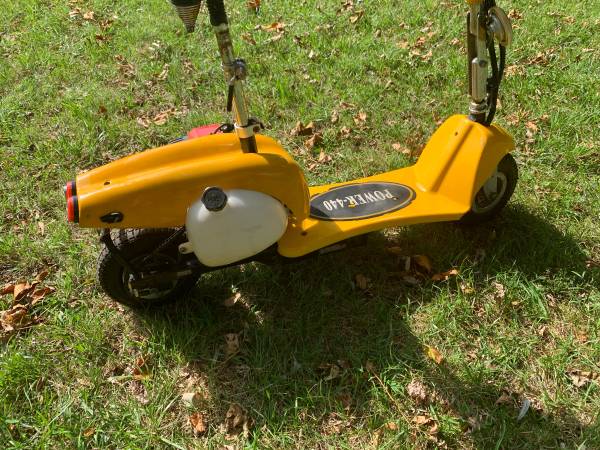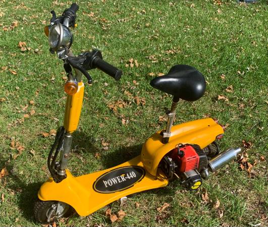 Gas powered scooter. It ran great until the wrong gas got put into it. It needs a new engine.
