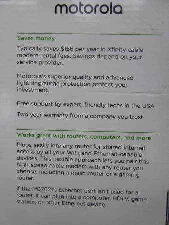 This Motorola MB7621 cable modem is a reliable and high-performance device that is compatible with Xfinity and other Comcast services. It is a DOCSIS 3.0 modem that offers fast and efficient internet connectivity through a single Ethernet (RJ-45) port. The modem is designed to provide a seamless internet experience with a black color that complements any home décor.