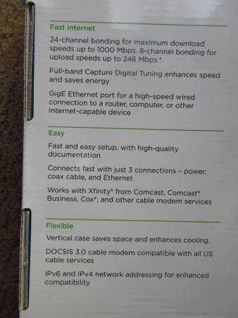 Unit is compatible with Xfinity, no built-in router, modem only. Comes with power and ethernet cords. The modem has been used for two years and is in excellent working condition.