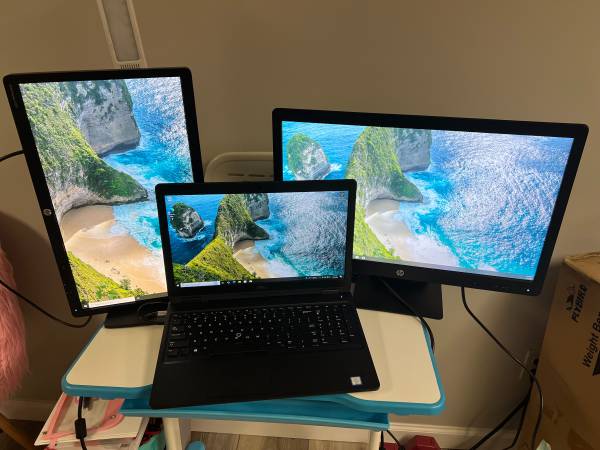 Surplus from a Government Agency in NY State. Fairly nice condition, see pictures. Presented here as a BUNDLE - a multiport docking station to connect all this, two monitors (one is 21" for sure, the other will be guaranteed 19" or larger), speakers & a set of wireless accessories (these last two not shown in the pictures). Look - these are not new, laptop may have a few marks, monitor the same... but it all works... and look at the price. If you only want one single monitor, then the price is $ 250 (no docking station).