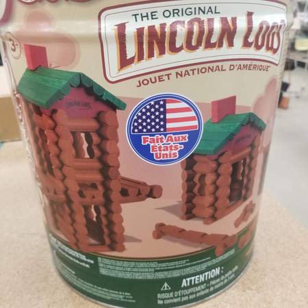Cleaning out gently used toys that are no longer used. The set builds the structures shown on the tin can or create your own builds. The set includes all 111 all wood pieces: natural green logs , roof trusses, chimney, flat green roof. Includes storage tin. I will keep the posting up until sold