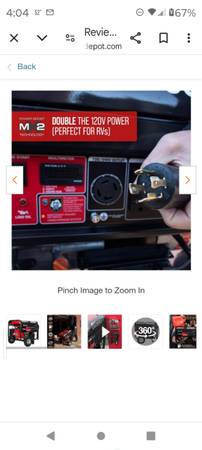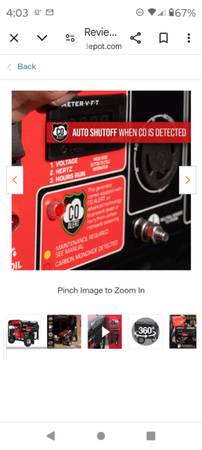 This Generator is Brand New in an unopened box ... 224cc engine, electric start and pull start backup, CO alert - If CO levels get to high, generator shuts down automatically,a Great safety feature... Generator has 100% copper windings, is EPA and CARB approved, has OHV Air cooled engine, has idle control - referred to as Auto Throttle, which maintains the engines RPM's under varying loads... This helps with fuel consumption and noise levels... This Generator includes wheel and handle kit and is great for camping , RV's, power on the job site as well as power outages at home ... Delivery available within reason...$500.00 Firm...